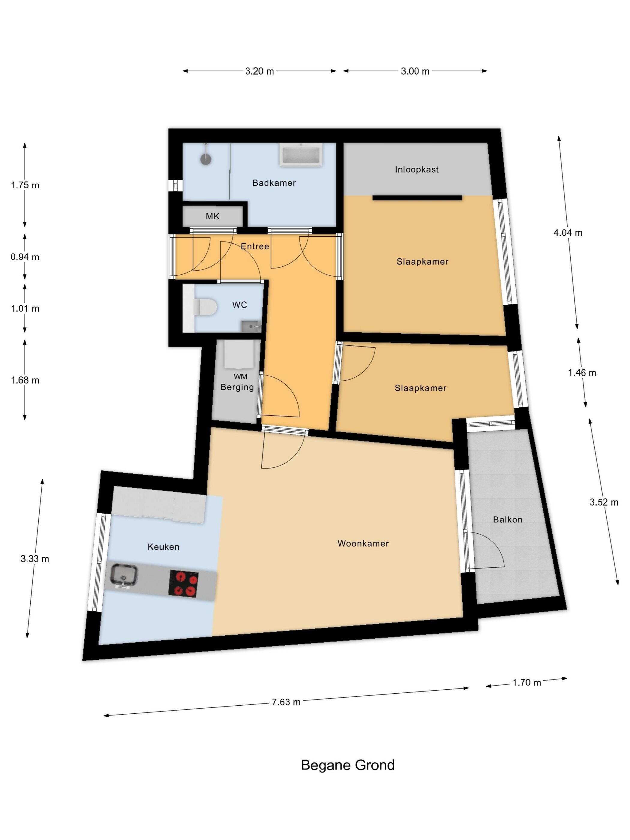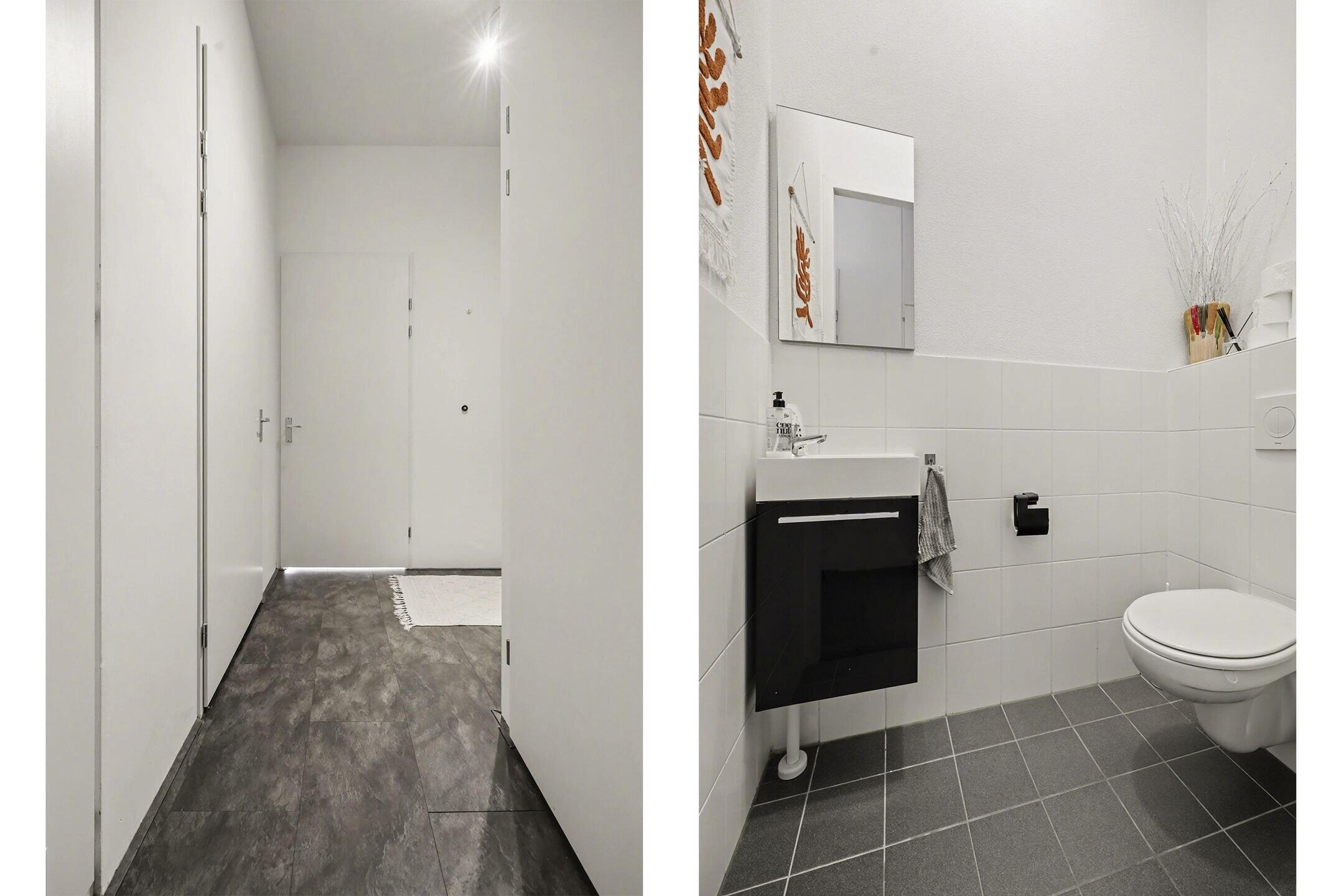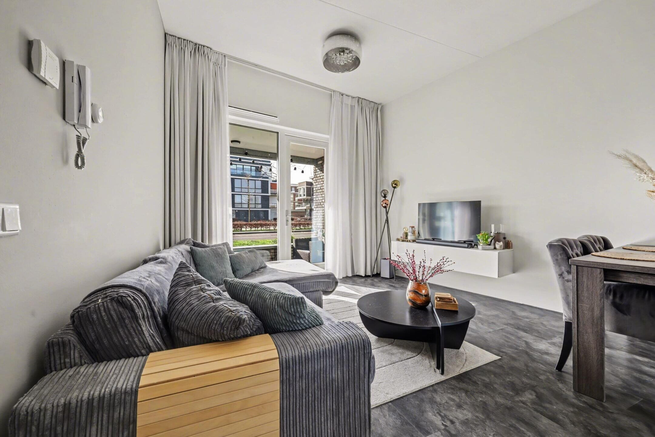 Het appartement bevindt zich op de begane grond en beschikt over een eigen entree. In de hal bevinden zich de meterkast en een modern toilet. Vanuit hier heb je toegang tot de verschillende vertrekken van de woning. De woonkamer is heerlijk licht dankzij de grote raampartijen aan zowel de voor- als achterzijde. De ruimte is netjes afgewerkt met een laminaatvloer en strak gestucte wanden, wat zorgt voor een moderne en verzorgde uitstraling. De aanwezige vloerverwarming draagt bij aan een aangenaam en gelijkmatig wooncomfort. Vanuit de woonkamer stap je zo het balkon op, waar je door de gunstige ligging op het zuidwesten kunt genieten van de middag- en avondzon.