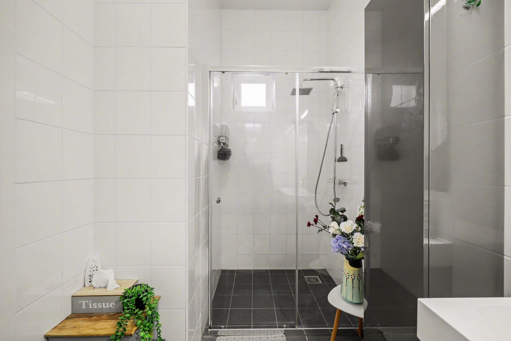 The apartment offers two well-finished bedrooms, both benefiting from pleasant natural light. The rooms are flexible and can be used as a master bedroom, home office, or guest room. The bathroom is modernly tiled and fitted with a spacious walk-in shower and a double washbasin with vanity unit. Additionally, there is a practical separate laundry room with connections for a washing machine.